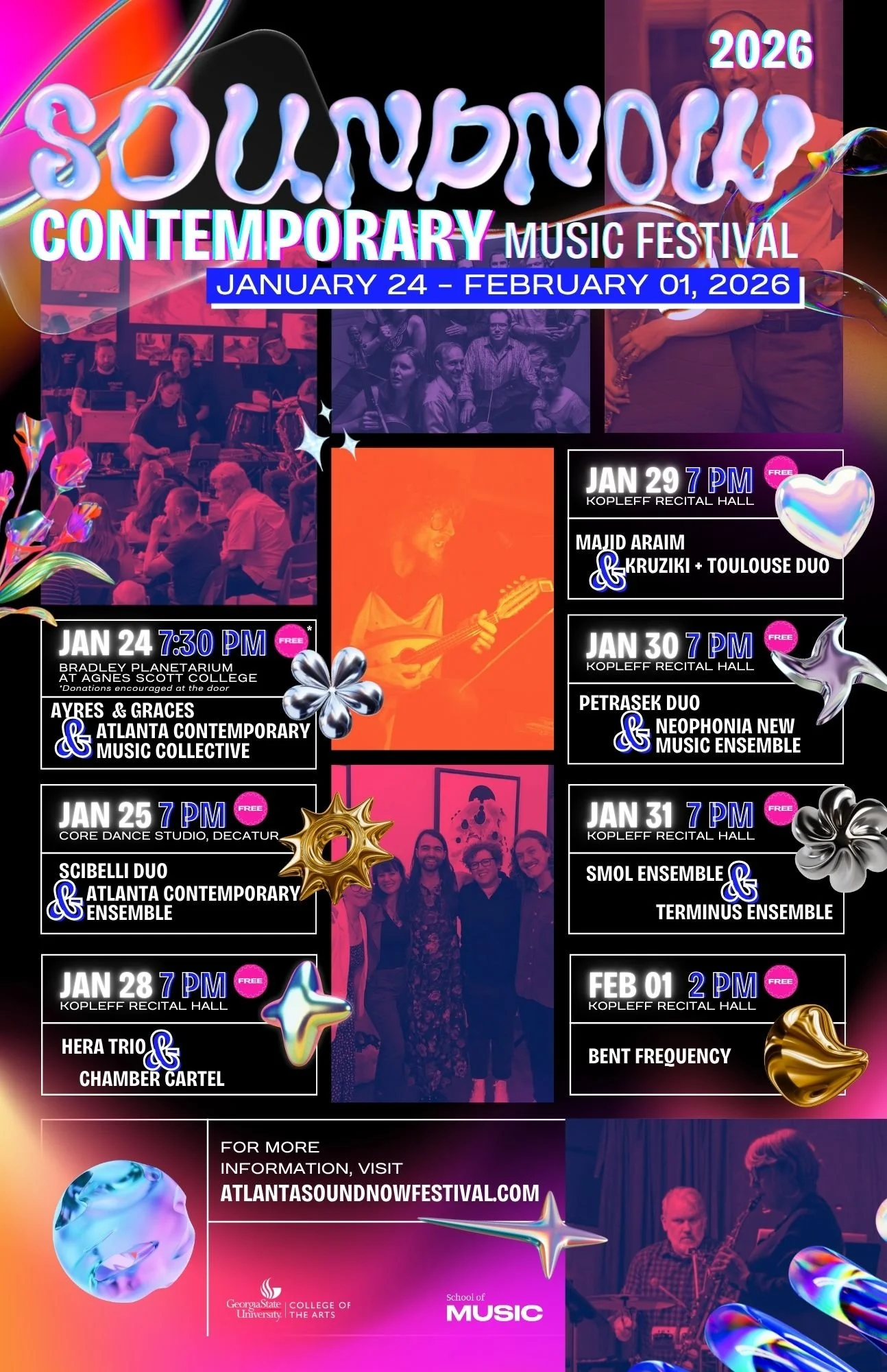 JOIN US NEXT YEAR FOR OUR 10 YEAR ANNIVERSARY SEASON! SoundNOW will once again proudly present the very best in classical contemporary music as performed by Atlanta’s premiere new music ensembles. Be on the lookout for our announcement of the 2027 festival dates later this spring! Atlanta audiences will once again have an opportunity to experience an incredible week of contemporary music as many of Atlanta’s best new music ensembles come together for a dynamic showcase of the city's vibrant new music scene!